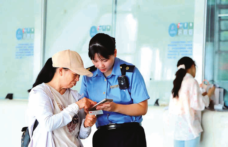 刚帮完这位大爷,傅慧珍就注意到人群外张望的大娘。交流后得知,大娘已经买完票,想取张纸质车票去乘车。“现在不用纸质车票,您直接凭身份证就能乘车。”见大娘面露犹疑,她接过手机,指着12306平台推送的信息说,“您看,这上面检票口、车次、开车时间、座位号都有,候车室就在楼上,跟坐公交一样,‘嘀’一下就行。”大娘感慨:“以前取出来还怕丢票,现在可太方便了。”