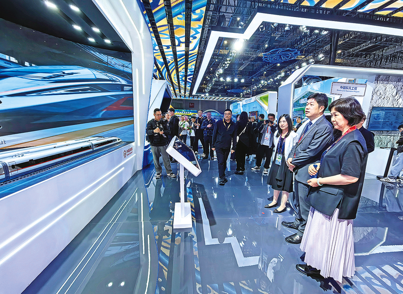 11月5日至10日,第八届中国国际进口博览会在上海举办。在国家会展中心(上海),CR450动车组、铁路智能建造、中欧班列等铁路元素闪耀进博会。图为参展观众驻足观看中国馆内CR450动车组样车模型。