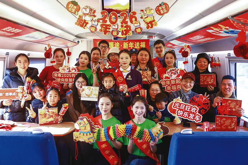 12月29日,杭州客运段高铁四车队在G7467次列车上开展“驿家暖途·新年送福”元旦迎新活动。乘务员们通过开展诗朗诵、迎新手势舞、剪纸和抽新年盲盒等活动,为旅客们送去新年祝福。