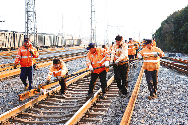 近日,阜阳工务段紧抓年初有利时机,精心组织,利用站场维修天窗对阜阳北站编组场关键设备进行集中检修整治,为保障春运期间枢纽畅通提前“储能”。图为该段组织职工推运钢轨,做好更换长轨准备工作。