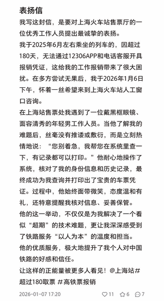 “我写这封信,是要对上海火车站售票厅的一位优秀工作人员提出最诚挚的表扬。”发文的博主娓娓道来。