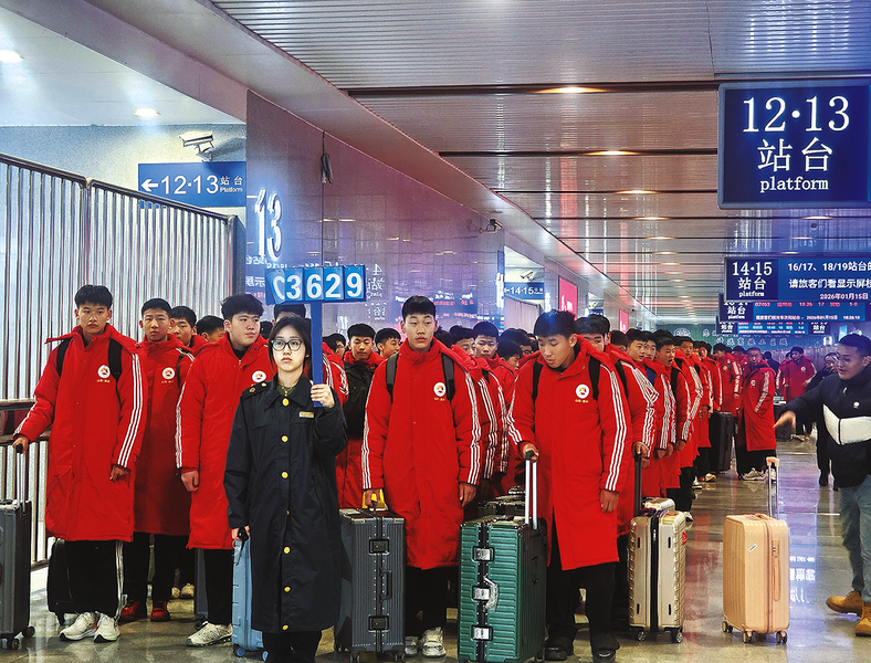 金华车务段义乌站为2026年春晚义乌分会场参加彩排的学生团体提供便捷出站服务。该站通过提前对接出行信息、强化站台乘降组织、安排专人候车引导、按需增开出站通道等措施,有效满足该团体出行需求。图为义乌站客运员引导参加春晚排练的学生团体出站。