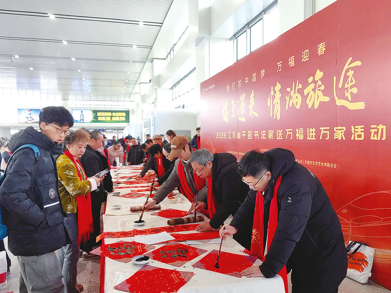 徐超 摄 本报讯(记者 朱明轩 通讯员 朱莹)2月1日10:00,“万福迎春”2026“福至运来 情满旅途”——江苏省千名书法家送万福进万家活动在南京南站正式启动。活动现场墨香四溢,书法家们挥毫泼墨,为旅客送上新春祝福。