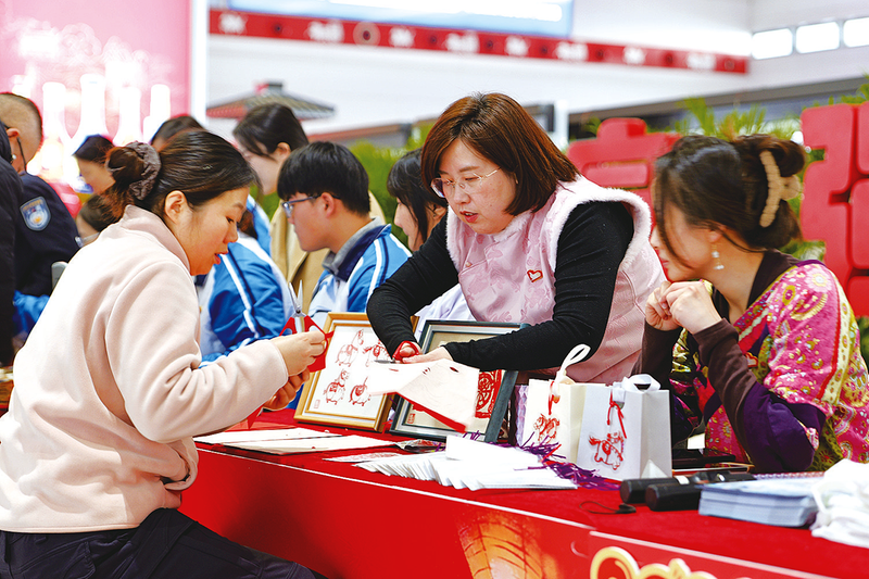 图②:徐州直属站组织人员在徐州东站候车大厅开展非遗传统文化传承活动。图为工作人员在教旅客剪纸。 (通讯员 张光磊 摄)