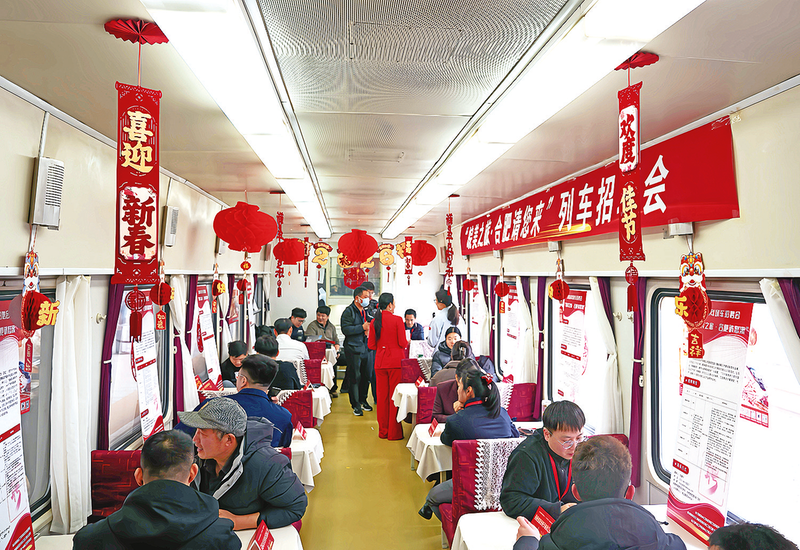 车厢内,列车工作人员早早布置好了现场。餐车餐桌化身招聘展位,整齐排列的招聘展板引人注目,上面详细列出了各个企业的招聘信息和岗位需求,红灯笼、“福”字窗贴、“新年快乐”字样的挂饰,为招聘会增添了浓浓的年味。