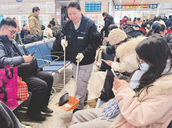 “华铁,B22地上有散落水果。”“好的,马上到!”徐建梅腰间别着的对讲机发出呼叫声,她赶忙推着清洁车前去清扫。她说:“春运期间客流量大,我们的任务就是在人潮间隙做好候车大厅卫生保洁,为大家打造干净舒适的出行环境。”