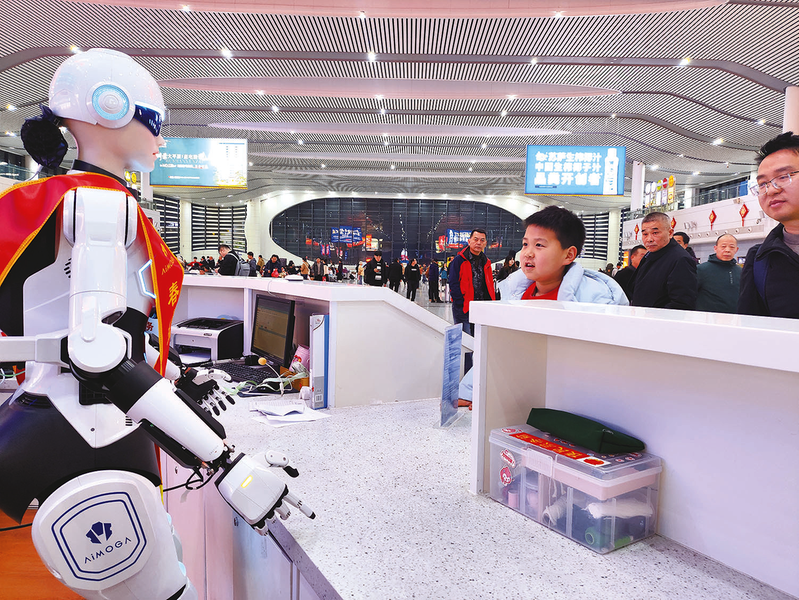芜湖站在候车大厅“皖江明珠”雷锋服务站和“两区一室”候车区放置两台人形机器人,以拟人化的互动服务,为旅客带来全新体验。 (通讯员 王申 摄)