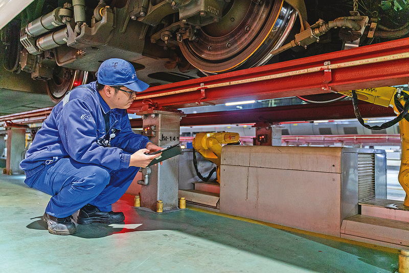 上海动车段运用动车组智能检修系统精准守护动车组走行部安全。这套系统由检测机器人、中心服务器、手持移动终端、列位检测、信息管理平台五大模块构成,可全自动完成全型号动车组车底、转向架可视部件检测,实现数据无线传输、故障自动研判,且不受车顶接触网供电限制,大幅提升检修效率与精度。图为地勤机械师在操作动车组检修机器人。 (通讯员 方凯强 供图)