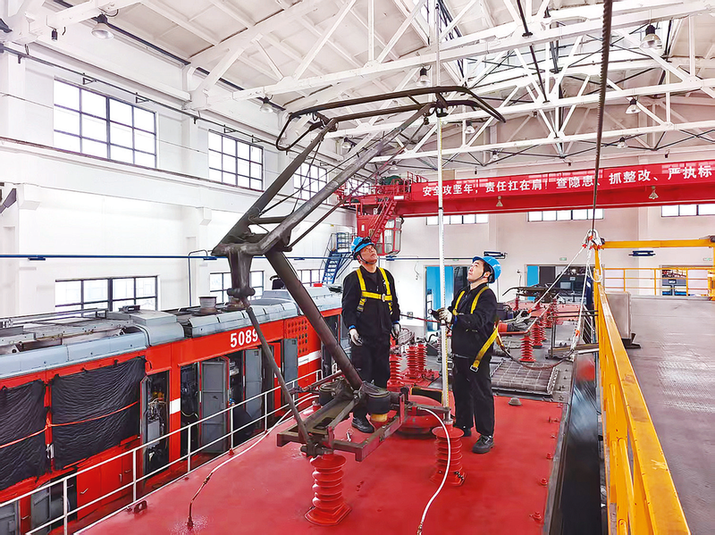 合肥机务段认真开展2026年度春季机车鉴定工作,重点对机车走行部、制动机、机车电线路及电力机车高压电器等设备,以及机车防过热防漏雨和机车文明化等项目进行整治,全面提升机车运用质量。图为该段阜阳检修车间职工在对电力机车受电弓进行检修。(通讯员 王道强 摄)